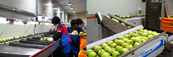“입고된 사과는 비파괴 당도선별기를 거칩니다. 보통 13브릭스(brix)이상을 고당도로 분류해요. 이후 육안 선별을 통해 상품성이 떨어지는 흠과를 걸러냅니다. 그 다음엔 크기별로 자동 선별해요. 사과의 크기 단위는 ‘과’인데요. 숫자가 작을수록 과실이 큽니다. 가장 보편적으로 유통되는 여름 사과는 6과(215g), 7과(190g)입니다. 크기별로 분류해 포장한 사과는 하나로마트, 홈플러스 등의 대형마트와 온라인 플랫폼에 유통합니다. 통상 입고 후 5일 안으로 판매하는 걸 원칙으로 해 신선합니다.”