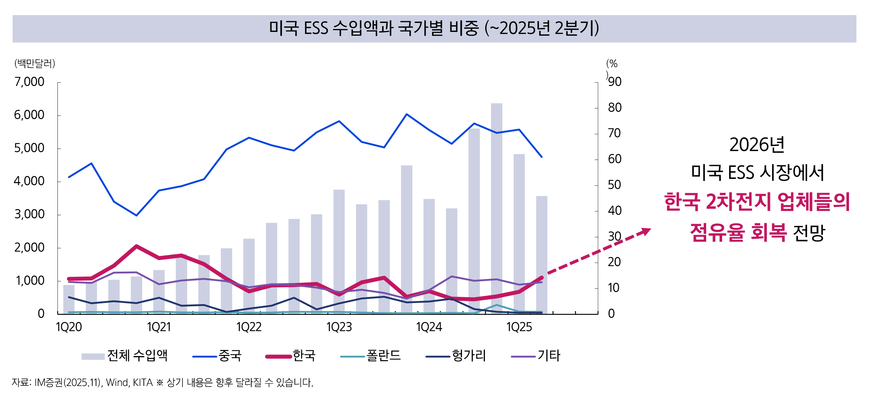 김 팀장은 “올해 미국 전기차(EV)도 두 자릿수 역성장이 불가피하다”고 봤다. 미국 전기차 시장은 세액공제 종료 이후 월별 판매가 전년 대비 30% 이상 감소한 달도 나왔다. 이에 비해 에너지저장장치(ESS)는 데이터센터 증설과 맞물려 성장세다. LG에너지솔루션·삼성SDI 등은 EV 부진을 ESS로 일부 상쇄 중이지만, 가동률·수익성 회복엔 시간이 필요하다는 진단이다. 그는 “미국 ESS 매출 비중이 높은 업체, 특수변압기·전력기자재 등 ESS 특화 기업이 상대적으로 유리하다”고 조언했다.