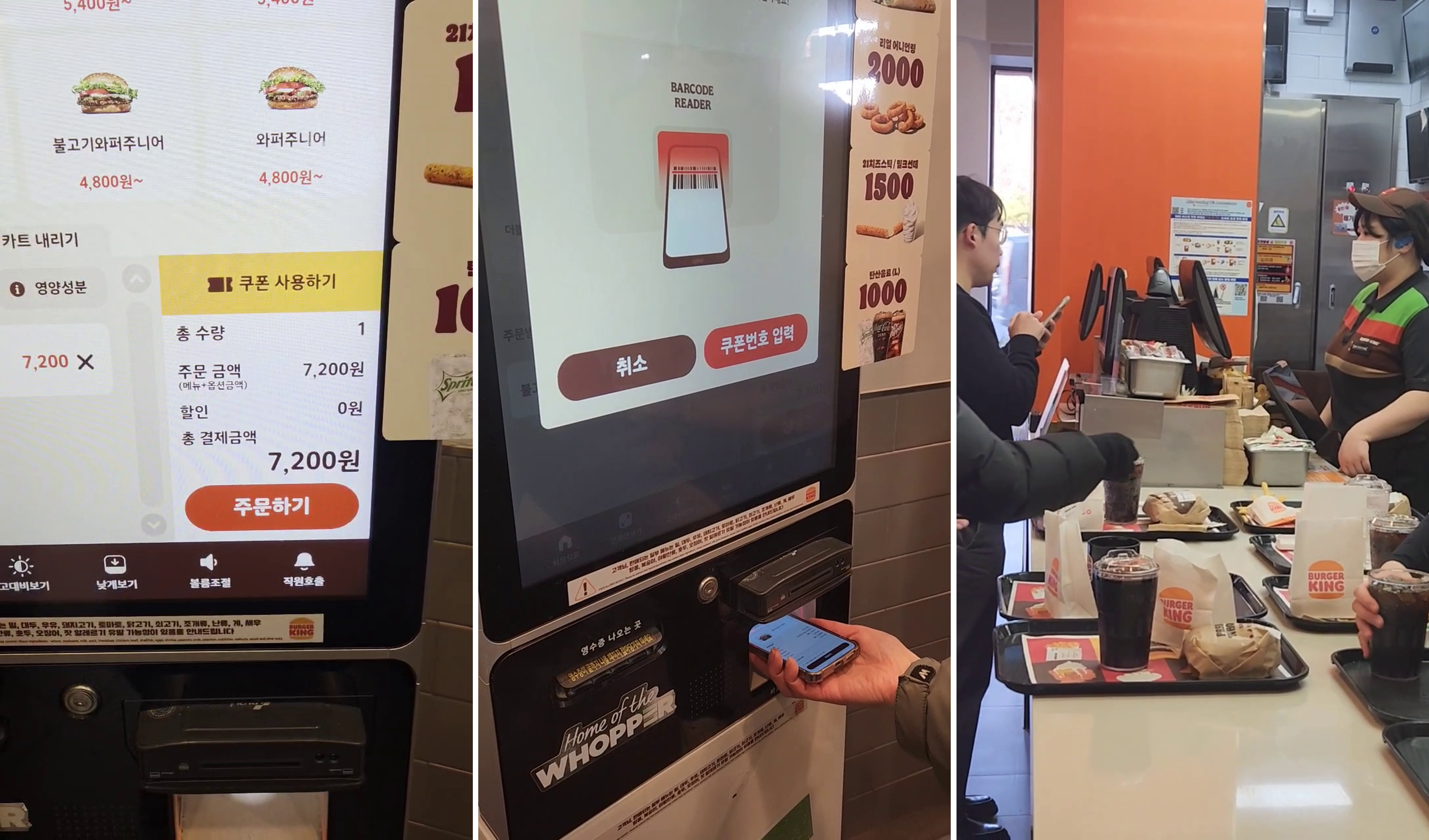 할인 쿠폰을 쓸 때는 주의가 필요합니다. 메뉴를 먼저 담는 것이 아니라, 키오스크 하단 바코드 인식기에 쿠폰을 먼저 갖다 대야 합니다. 바코드를 찍으면 해당 메뉴가 자동으로 장바구니에 담깁니다.