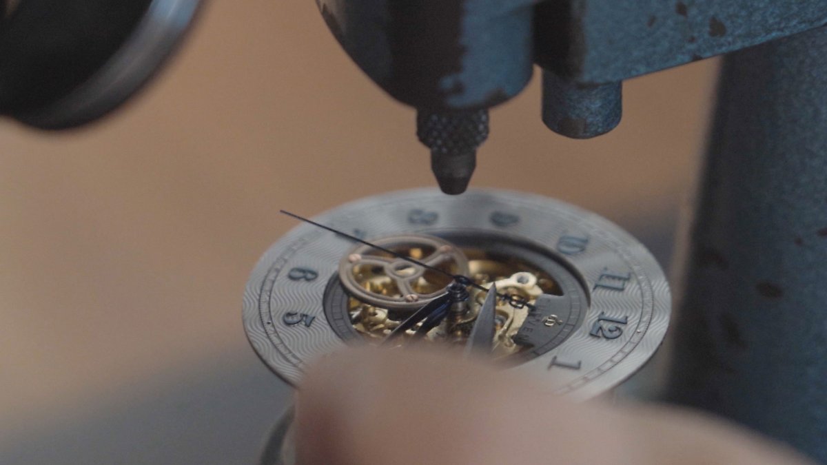 본격적으로 조립하기 전에 확대경을 착용합니다. 각 부품을 결합하기 전 최종 점검하는 절차도 생략해선 안됩니다. 부품이 잘 작동하는지 확인하고, 나무 막대로 다이얼 표면에 묻은 얼룩도 제거합니다. 한 톨의 먼지도 들어가지 않게끔 심혈을 기울여야 하죠.