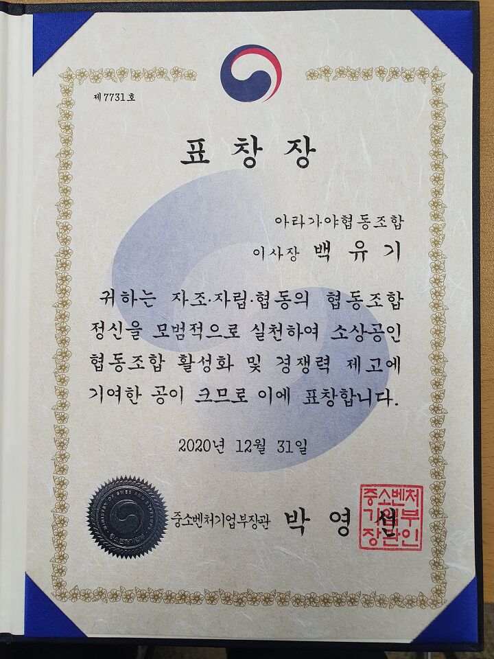 아라가야협동조합이 받은 중소벤처기업부 장관상